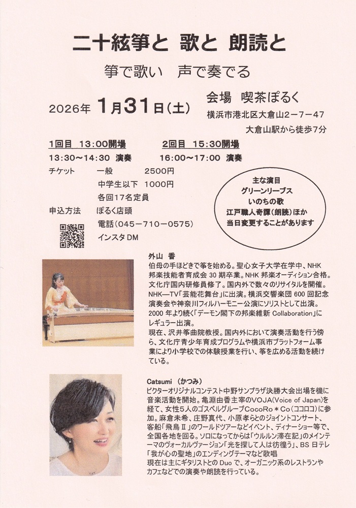 2026/1/31 喫茶ぽるく「二十絃箏と歌と朗読と」にて演奏いたします